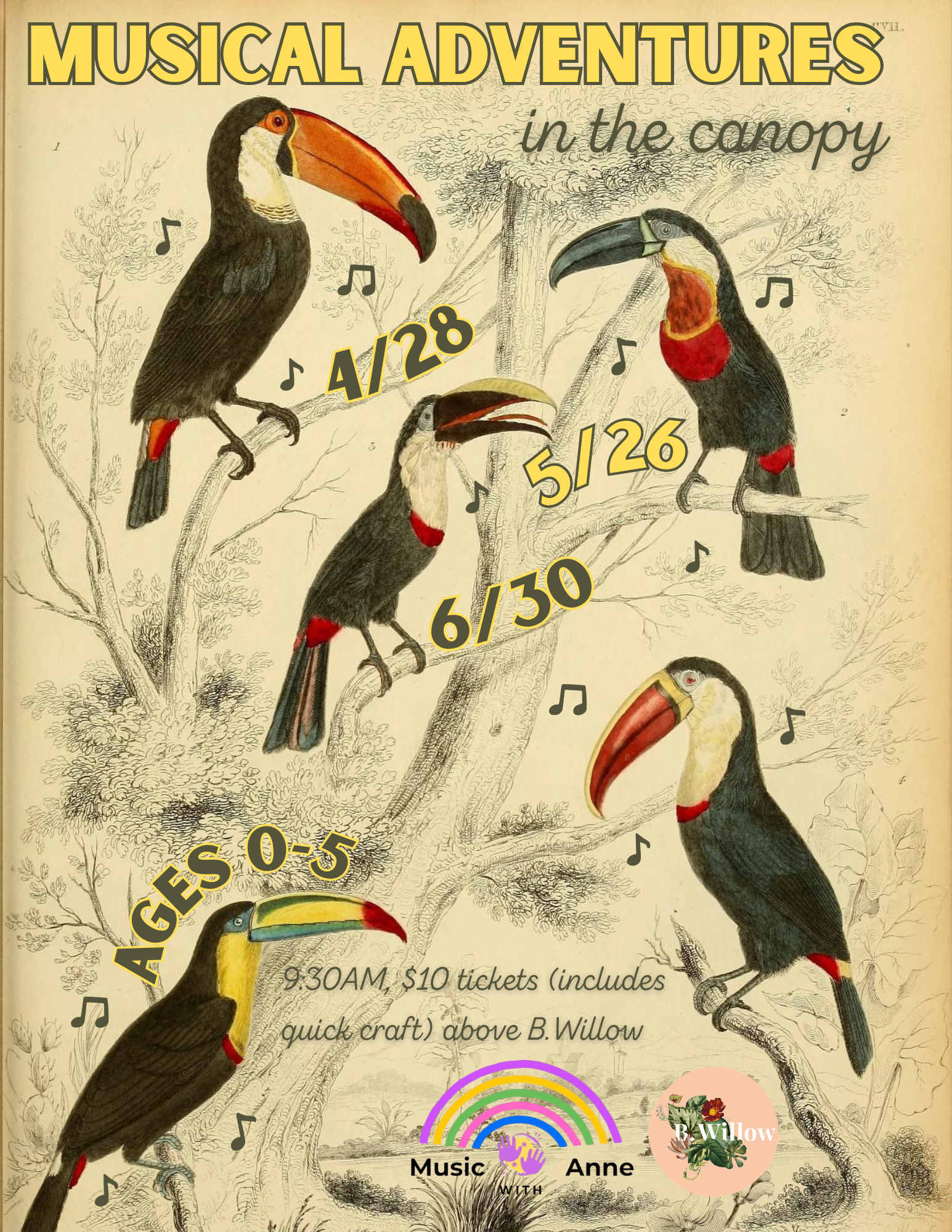 Join Miss Anne on a musical adventure in the B.Willow Canopy! Turn into an insect, explore found nature sounds, and more! Each session is nature inspired and will include 30 minutes of music exploration followed by 30 minutes of a craft/social time. Great for ages 0-5 and their grownups!